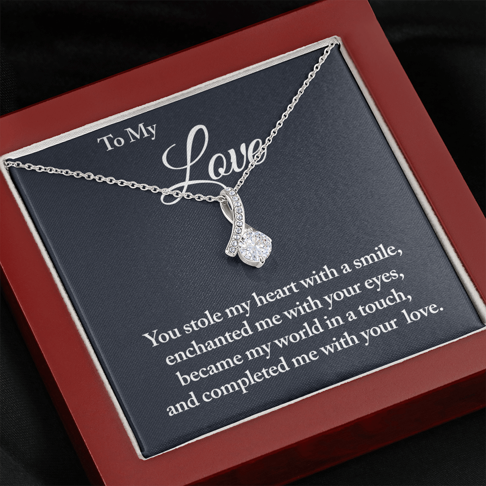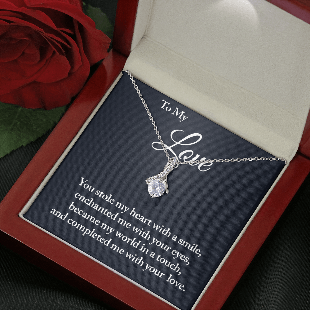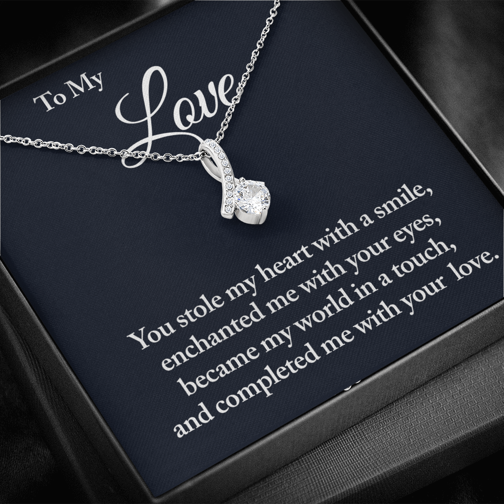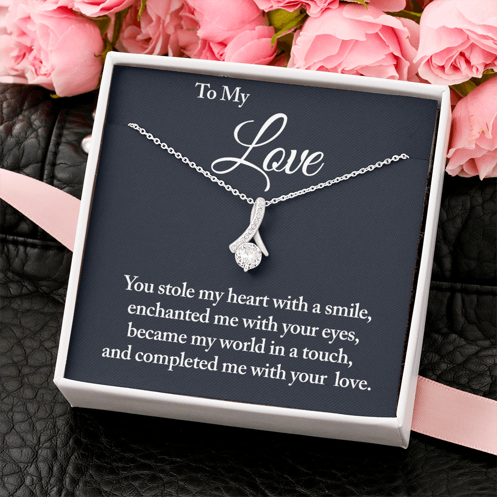Melt her heart with this ALLURING BEAUTY necklace gift! The petite ribbon shaped pendant is finished with 14K white gold over stainless steel, and is embellished with dainty clear crystals surrounded by a sparkling 7mm round cut Cubic Zirconia.