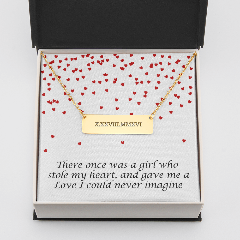 Celebrate and remember a special date with a custom piece of handcrafted jewelry. This Roman Numeral Horizontal Bar Necklace can be personalized with any specific date. Simply enter the date, and our system will convert your date into a roman numeral. The perfect gift for graduations, weddings, engagements, and more.