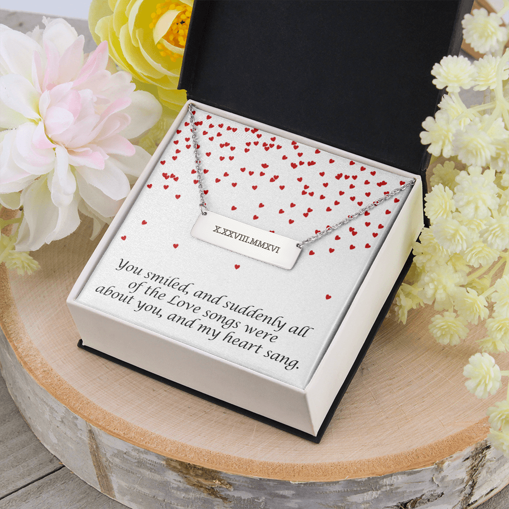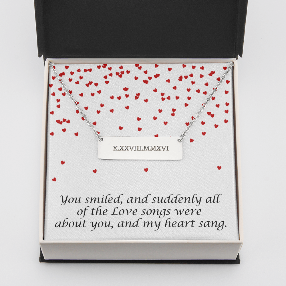 Celebrate and remember a special date with a custom piece of handcrafted jewelry. This Roman Numeral Horizontal Bar Necklace can be personalized with any specific date. Simply enter the date, and our system will convert your date into a roman numeral. The perfect gift for graduations, weddings, engagements, and more.